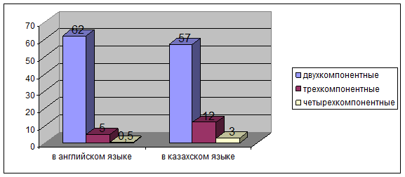 Полилексемные терминологические сочетания делятся на двухкомпонентные, трехкомпонентные, четырехкомпонентные, где наиболее распространенными являются двухкомпонентные сочетания, образованные по модели «имя сущ. + имя сущ.»: англ. – compressor oil (компрессорное масло), paraffine wax (пластичная глина); каз. – көмірлі балама ─ эквивалент угольный, газ абсорбциясы (абсорбция газов). К данной модели в английской терминолексике относится 62%, в казахской ─ 57% от общего числа двухкомпонентных сочетаний.