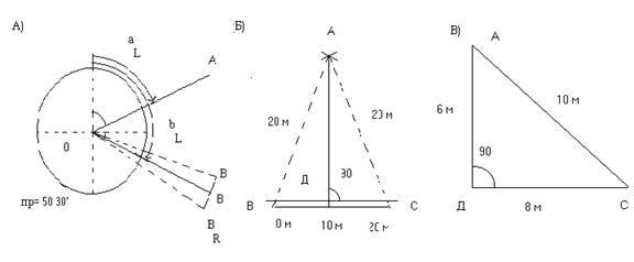 При строительстве часто возникает необходимость в построении прямого угла с небольшими сторонами и несколькими требованиями к точности построения. Для этих целей используют рулетку. При построении (рис 1 б) рулетку укладывают в створ линии ВС, совмещают штрих 10 м с вершиной угла Д и по штрихам 0 и 20 м отмечают положение точек В и С. Раствором рулетки 20 м из этих точек делают засечки и получают положение точки А.