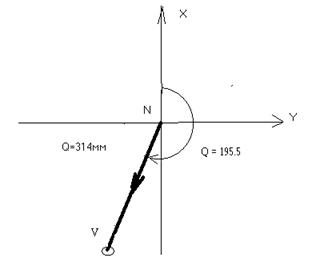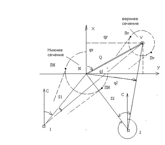 Пусть точка N – центр нижнего сечения сооружения, точка V – центр верхнего, контролируемого сечения (рис. 13). Требуется определить отклонение Q=NV и азимут отклонения aQ. Отклонения вызванные наклоном фундамента, называют креном.
