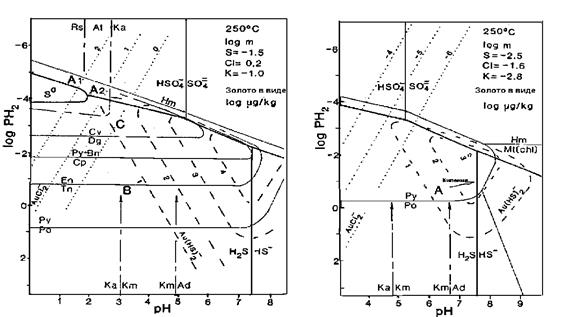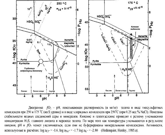 при 2500 С и концентрациях NaCl для Вайотапу. Если концентрации хлоридов увеличивались на порядок, то изолинии растворимости должны сдвинуться на 2 единицы рН вправо. Даже при повышенных концентрациях хлоридов золото в глубинных эпитермальных гидротермах, должно переноситься в основном в виде сульфидных комплексов.