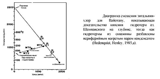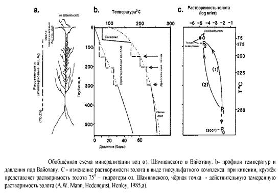 Рисунок 2,с комбинирует все различные факторы, влияющие на растворимость золота, так как сульфидный комплекс, как и гидротермы, отвечающие химическому составу гидротерм Вайотапу, кипят от 2500 С до 1750 С. Наибольшее влияние на растворимость золота оказывают потери или в зависимости от механизма перехода газа в пар). Если содержание золота в глубинных гидротермах 1—3 мг/кг и кипение происходит как под оз. Шампанским, то система Вайотапу в настоящее время должна отлагать золото в трещинных каналах гидротермальных извержений под оз. Шампанским.