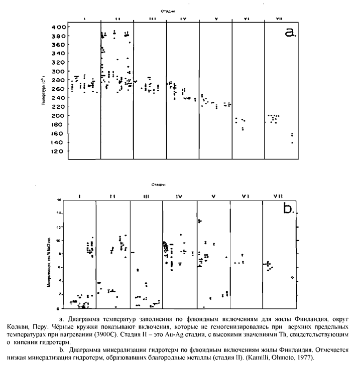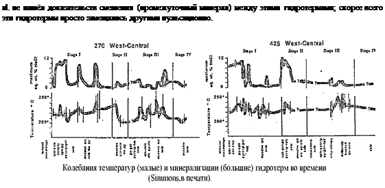 В частности, разбавление любых хлоридных гидротерм будет уменьшать растворимость хлоридов комплексированных металлов в соответствии с реакциями 5- Однако, Simmonsetal. пришли к выводу, что даже в относительно минерализованных растворах серебро-полиметаллических месторождений Фреснилло в Мексике, кипение является главным фактором, контролирующим отложение золота. Несмотря на большое уменьшение минерализации во времени,, серебро и неблагородные металлы отлагались из минерализованных гидротерм только совместно с кварцем, отлагающимся из разбавленных гидротерм. Simmonset.