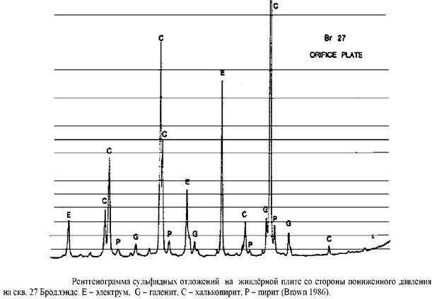 Этот механизм отложения золота при переходе газа в пар также описывался Brownна оголовках скважин в современной системе Бродлэндс. Чешуйки сульфидов, обогащённых халькопиритом, образуются непосредственно в нижней части потока в нескольких скважинах. Эти сульфидные отложения содержат до 3 вес.% золота и 30 вес.% серебра. Brownопределил, что это происходит в результате фракционирования H2S и Н2 при переходе в паровую фазу, которая вызывает осаждение золота из оставшейся жидкости.