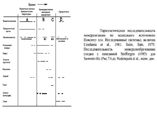 Известно, что первичные гидротермы в этих системах были очень кислыми, относительно окисляющими, возможно насыщенные хлором и с более высоким содержанием общей серы, чем низкосерные системы. Однако, Stoffregenи Hedenquistetal., приводят доказательства осаждения золота из ранних вулканогенных гидротерм. Кроме того, поздние гидротермы более похожи на метеорные воды, чем на вулканогенные. Они менее минерализованы, более восстановленные, менее кислые. До тех пор пока нельзя лучше охарактеризовать химическую эволюцию этих гидротерм последующие идеи будут, в основном, предположительными.