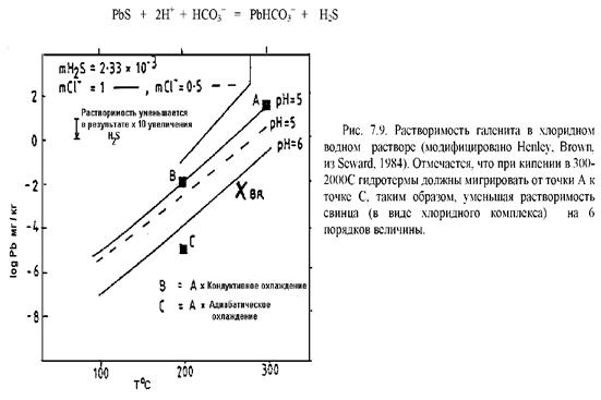 Рисунок 9 показывает расчётную растворимость галенита в виде функции температуры для 1.0 моль раствора хлорида. Отмечается большая растворимость свинца, чем в гидротермах Бродлэндс при увеличении содержания хлора в 25 раз. Следуя Henleyможно рассчитать увеличение растворимости, ожидаемой при 2650С, если соединения, подобные PbHCO3 +, присутствуют. Мы имеем простую реакцию для образования PbHCO3 +.