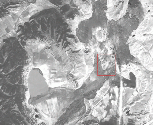 | Рис. 5. Снимок района оз. Чёрного в Северной Хакасии и куэстовой гряды «Сундуки» (показана красным прямоугольником), сделанный со спутника SPOT (разрешение 10 м). (http://pict1004/mail.ru) |