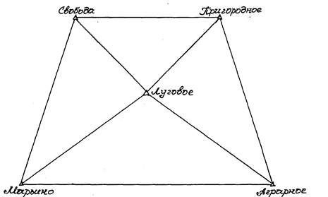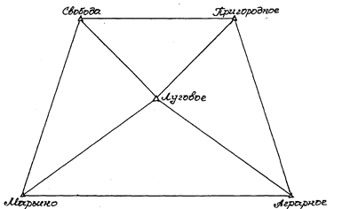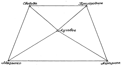 На рисунке 1 приведена схема триангуляции 2-го разряда. Пункт полигонометрии «Марьино» является пунктом геодезической сети высшего разряда Сторона между пунктами «Марьино» и «Луговое» является исходной.