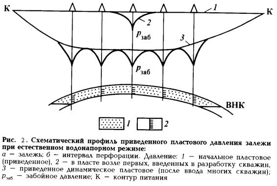 Давление в пласте у забоя скважины при ее работе называют забойным давлением Pзаб. По мере разбуривания залежи, дальнейшего ввода скважин в эксплуатацию и увеличения таким путем общего отбора жидкости из залежи воронки депрессии давления на забоях скважин сближаются, одновременно происходит постепенное снижение пластового давления в залежи в целом. Образуется общая для залежи воронка депрессии давления, осложненная локальными воронками скважин.