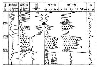 Данные гамма-метода могут привлекаться также при оценке характера насыщения и изучении коллекторских свойств пород. Показано влияние смены насыщающих флюидов на естественную гамма-активность коллекторов. Содержание газа в поровом пространстве коллектора значительно снижает общую плотность. Вследствие этого в коллекторах с высокой естественной гамма-активностью минерального каркаса и содержащих газ при невысоком давлении (сеноманские газовые залежи севера Западно-Сибирской равнины - Уренгойское, Медвежье и др.) гамма-метод может выделять газоносные пласты повышенными значениями естественной радиоактивности (рис. 1).