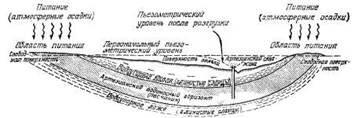 Ранее движение артезианских вод уподобляли потоку в трубе с источником питания, расположенным выше точки истечения воды. В большинстве учебников гидрогеологии артезианский бассейн представлен в виде синклинальной структуры с областями питания, расположенными выше уровня разгрузки воды. Первоначальный уровень артезианских вод постепенно понижается от областей питания в сторону очага разгрузки. Артезианский водоносный горизонт залегает между пористыми, но почти непроницаемыми слоями, называемыми водоупорами и слабоводопроницаемыми слоями. Такое строение типично для многих больших артезианских бассейнов. Однако в природных условиях их разнообразие бесконечно. Ниже описано несколько типичных артезианских бассейнов.