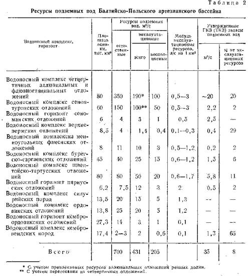 Эксплуатационные ресурсы подземных вод Балтийско-Польского бассейна оцениваются примерно в 430 м/с, из них около половины приходится на долю восполняемых. Восполняемые ресурсы принимаются равными около 30% от естественных. Распределение эксплуатационных ресурсов по основным водоносным горизонтам приведено в табл.2. Как видно из таблицы, около 45% ресурсов приурочено к четвертичному и 25% — к сеном-туронскому водоносным комплексам. Очень незначительными ресурсами, измеряемыми несколькими кубическими метрами в секунду, характеризуются сеноманский, верхнепермский, кемброордовикский и кембро-вендский горизонты и комплексы.