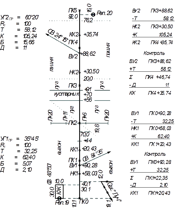 К2 = ( R 2 *π* Уг.2лев )/180 ° = (100*3,14*60,33)/180 = 105,24 м