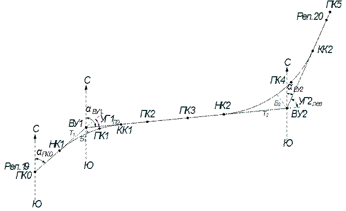 НПК1+44 = НПК0 +(i1 dПК0-ПК1+44 ) = 106,5+(-0,020*144)= 103,62 м