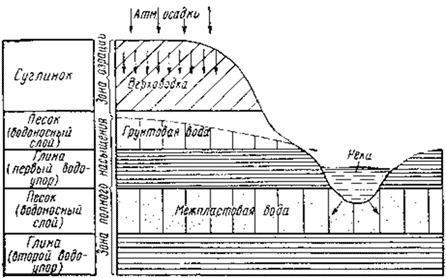 – верхняя – зона аэрации, расположена между поверхностью земли и уровнем грунтовых вод. В этой зоне наблюдается просачивание атмосферных осадков из поверхности вод вглубь, в сторону зоны насыщения.