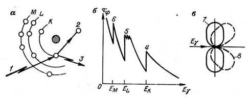 Фотоэлектрическое поглощение. Фотоэффект на К – электронах происходит при энергиях, соизмеримых с энергиями связи электронов с ядром. При этом гамма – квант передаёт свою энергию электрону. Это можно описать формулой: