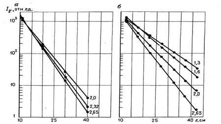 Из графиков видно (рис.3), что по мере роста длинны зонда при одинаковых значениях плотности, различия в скорости счета то же увеличивается. При увеличении z (I3 ) от 35 до 100 см влияние промежуточной среды уменьшается примерно в 2 раза, но еще остается достаточно большим (0,04—0,06 г/см3 на 1 см глинистой корки), что не позволяет отказаться от учета этого