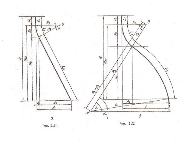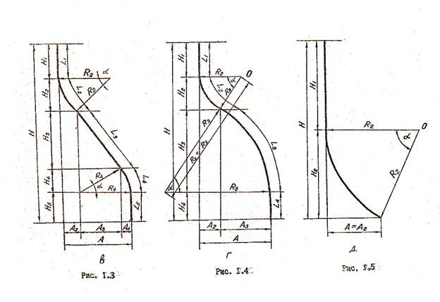 При расчете профиля типа "б" (рис. 1.2) после выбора длины вертикального участка Н1 находят радиусы искривления R2 и R3 . Величину R3 принимают на основании практических данных.