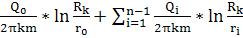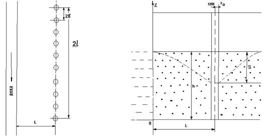 3. Определяем величину понижения уровня в скважине водозабора при ее размещении на расстоянии L2 =1200 м от уреза реки. Учитывая что, L2 > l , можем воспользоваться методом обобщенных систем, используя формулы: