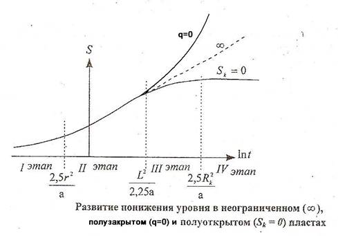 Отразим полученные результаты расчетов на графике и убедимся, что график для схемы неограниченного пласта является медианным по отношению к схемам полуоткрытого и полузакрытого пласта.