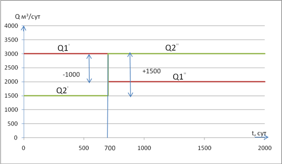 . Остаточный напор на начало эксплуатации Н=20 м . Расходы скважин изменяются во времени. Первые t1