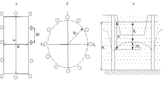 Песчаный карьер имеет размеры b х L равные 600 х 1200 м. По контуру карьера пробурены скважины с шагом 2σ =300 м, из которых осуществляется водоотбор с целью водопонижения с расходом Qо =1200м3 /сутиз каждой скважины. Водоносный горизонт заключен в песках и имеет мощность hе =40м. Коэффициент фильтрации песков k=10 м/сут, водоотдача μ=0,1. Определить величину понижения уровня под карьером и в скважинах, имеющих радиус фильтра ro =0,1м. Скважины совершенные. Продолжительность разработки карьера t=5 лет.
