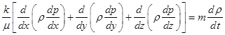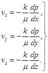 Подставляя в уравнение неразрывности (3.2) вместо проекций скорости фильтрации vx, vy и vz их значения из линейного закона, выражающегося формулой (3.1), получим: