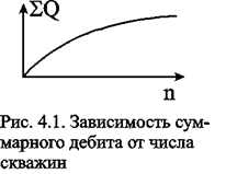 Замечено, что при эксплуатации группы скважин в одинаковых условиях, т.е. с одинаковым забойным давлением, дебит всего месторождения растёт медленнее увеличения числа новых скважин с теми же забойными условиями (рис.4.1). Увеличение дебита при этом требует понижения забойного давления.