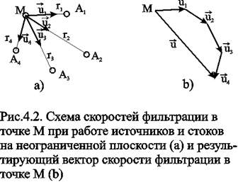 При совместном действии в пласте нескольких стоков (эксплуатационных скважин) или источников (нагнетательных скважин) потенциальная функция, определяемая каждым стоком (источником), вычисляется по формуле для единственного стока (источника). Потенциальная функция, обусловленная всеми стоками (источниками), вычисляется путём алгебраического сложения этих независимых друг от друга значений потенциальной функции. Суммарная скорость фильтрации определяется как векторная сумма скоростей фильтрации, вызванная работой каждой скважины (рис.4.2b).