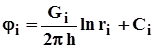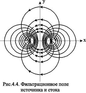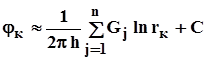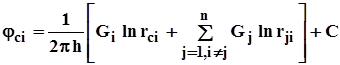Зависимость (4.2) физически означает, что фильтрационные потоки от работы каждого источника-стока накладываются друг на друга. Т.к. пласт предполагается неограниченным, то потенциал на бесконечности равен бесконечности. В центрах стоков-источников (ri=0) потенциал также равен бесконечности.