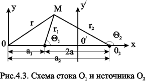 Пусть сток О1 и источник О2 равнодебитны, т.е. имеют одинаковые по модулю массовые дебиты G. Расстояние между источником и стоком равно 2а. Исследуем поток от источника к стоку.