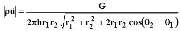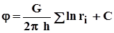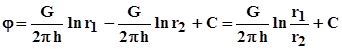 По формуле (4.2) определим потенциальную функцию потока. При этом учтем знаки дебитов: источник G 1= - G, а сток G 2= + G. После подстановки получим: