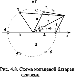 В обоих случаях дебиты скважин, равноудаленные от середины или от концов батареи, будут одинаковы, а при разной удаленности будут отличаться. Последнее вызывается не одинаковой интенсивностью влияния со стороны скважин батареи на те или иные скважины. При этом при нечетном числе скважин дебит средней скважины отличается от дебитов других скважин.