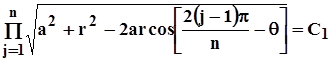 Рассмотрим поле течения в области действия круговой батареи, т.е. построим семейства линий тока и изобар. Уравнение изобар получаем из (4.3) путём представления радиусов rj в полярной системе координат (рис. 4.8)
