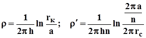 Здесь r выражает фильтрационное сопротивление потоку от контура питания к кольцевой батареи радиуса а в предположении, что поток плоскорадиален и батарея заменена галереей. Внутреннее сопротивление r/ - это сопротивление плоскорадиального потока от воображаемого контура окружности длиной 2pа/n к скважине. Величина 2pа/n - длина дуги сектора радиуса а, который содержит одну из скважин батареи.