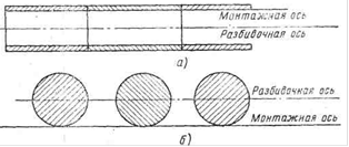 На обноску от пунктов внешней разбивочной сети с помощью теодолита переносят главные (основные) оси сооружения. Остальные оси (промежуточные, установочные) непосредственно разбивают на досках обноски, откладывая рулеткой расстояния по их верхней кромке. Оси предварительно фиксируют карандашом, а после увязки измерений окончательные положения осей фиксируют откраской или гвоздем.