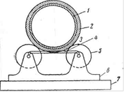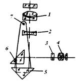 Способ вертикального проецирования основан на использовании специальных приборов типа зенит-прибора РZL (Германия), в которых линия визирования выставляется в отвесное положение. Зенит-прибор РZL (рис. 6) состоит из корпуса со зрительной трубой и подставки с оптическим отвесом. В зрительной трубе (рис. 7) размещены обращенный кверху объектив 1, фокусирующая линза 2, компенсатор 7 с призмой 5, преломляющая призма 6, окуляр 4 с сеткой нитей 3.