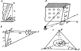 Рис.1. Схема измерения кренов зданий и сооружений: а - общий случай способа вертикального проецирования; б - с помощью теодолита; в - способом горизонтальных углов; г - способом угловых засечек.