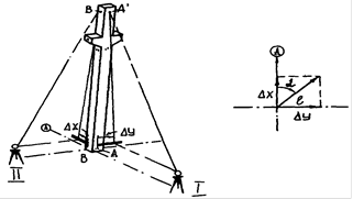 При измерении крена способом угловых засечек (рис.1,г) вокруг сооружения на расстоянии не менее одной и не более двух его высот закрепляют опорные пункты I, II и III, прокладывают полигонометрический ход и методом триангуляции вычисляют их координаты. С этих пунктов прямой угловой засечкой определяют координаты точек А и В по оси сооружения у его основания и на вершине (или только на вершине). При измерении углов принимают во внимание, что ошибка в одну секунду создает погрешность в определении крена до 0,5 мм на каждые 100 м расстояния. Для определения направления на наблюдаемую точку около измеренных углов ставят букву "Л" или "П", обозначающую расположение точки А слева или справа относительно створа со станции на точку В. По разности координат точек А и В (или одной точки В) в начальном и последующих циклах наблюдений вычисляют составляющие отклонения ΔХ и ΔУ за данный промежуток времени: