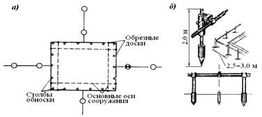 Деревянная обноска (рис. 1, а) состоит из двухметровых столбов, вкапываемых в грунт на глубину 1,0–1,2 м через каждые 2,5–3,0 м по периметру, и обрезных досок толщиной 30–50 мм, прибиваемых к внешней стороне столбов так, чтобы их верхние кромки были в горизонтальной плоскости. Для соблюдения этого условия на столбах предварительно с помощью нивелира намечают точки с одинаковыми высотами. Стороны обноски также должны быть параллельны осям сооружения.