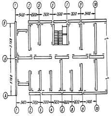Пункты внутренней разбивочной сети располагают на перекрытии подвала или непосредственно на блоках фундамента. Количество пунктов и форма внутренней разбивочной сети зависят от размеров и назначения сооружения, методов производства строительно-монтажных работ и других факторов. При строительстве сравнительно небольших зданий четырьмя пунктами закрепляются продольные и поперечные основные оси (рис.2), в зданиях сложной конфигурации закрепляются главные оси (см. рис. 3). Иногда для крупногабаритных сооружений внутренняя разбивочная сеть создается в виде нескольких фигур, повторяющих контур сооружения. При этом стороны сети располагают также параллельно основным осям сооружения, чтобы внутренние и монтажные оси можно было выносить непосредственно линейными измерениями или простейшими способами перпендикуляров и створов.