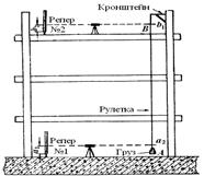 Передачу отметок на вышележащие этажи производят с помощью двух нивелиров, реек и подвешенной стальной рулетки. Рейки устанавливают на реперы, расположенные на исходном и данном монтажных горизонтах (рис. 10). Отсчеты по рулетке берутся одновременно по двум нивелирам. Для большей устойчивости рулетки к ней снизу подвешивают груз, помещаемый в сосуд с вязкой жидкостью. В результате наблюдений получают отсчеты
