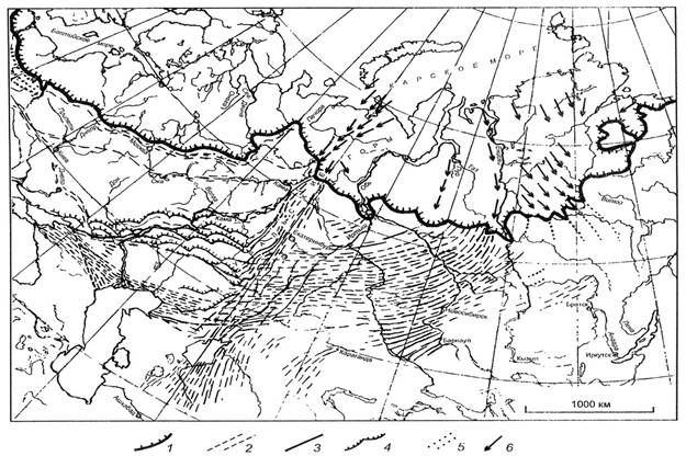 Рис. 1. Размещение грядово-ложбинных комплексов Северной Евразии (Гросвальд, 1999). 1 – максимальная граница последнего оледенения; 2 – простирание пластовых потоков (по бэровским буграм, гривам и др. следам); 3 – древние ложбины стока; 4 – огибающие долины; 5 – предположительное продолжение катастрофического стока; 6 – основные пути подледного стока.