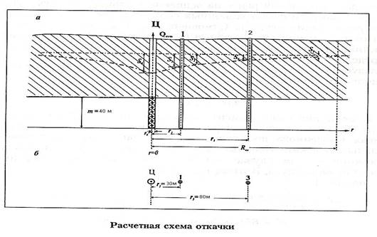 Откачка проводилась из напорного водоносного горизонта мощностью 40 м. с избыточным напором над кровлей120 м. Опытный куст состоит из эксплуатационной и двух наблюдательных скважин. Дебит откачкиQ=3000 м3 /сут, радиус центральной скважины r0 =0.15 м. Расстояние от центральной до наблюдательных скважин 30 и 80 м.