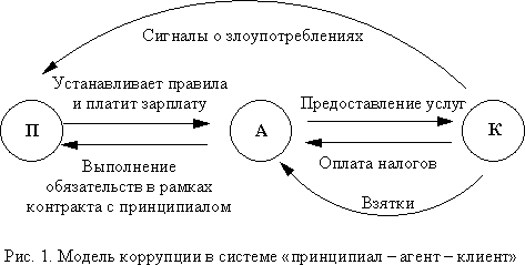В этой модели центральное правительство действует как принципал (П): оно устанавливает правила и назначает агентам (А), чиновникам среднего и низшего звена, конкретные задачи. Чиновники выступают при этом как посредники между центральным правительством и клиентами (К), отдельными гражданами или фирмами. В обмен на оплату налогов агент от имени принципала предоставляет клиентам различные услуги (лицензирует деятельность фирм, выдает гражданам социальные пособия, осуществляет найм работников на государственную службу и т.д.). Например, в рамках налоговой службы принципалом выступает государство в лице руководителя налоговой службы, агенты – это сборщики налогов, а в качестве клиентов выступают все налогоплательщики. В обмен на выплату налогов налогоплательщики получают возможность легально функционировать, в противном случае их ожидают штрафы и прочие наказания.