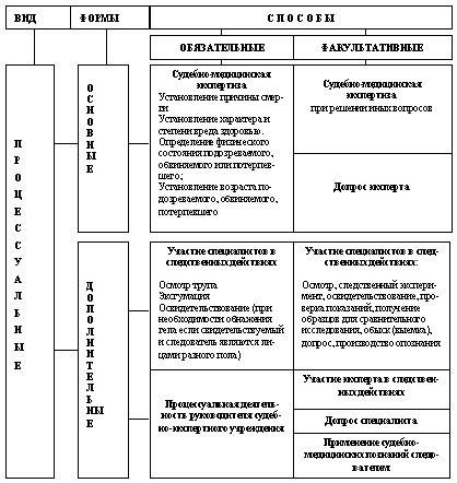 К процессуальным (схема 2) относятся производство судебно-медицинской экспертизы, допрос эксперта, участие эксперта или специалиста в производстве следственных и судебных действий, допрос специалиста, распорядительная деятельность руководителей государственных судебно-экспертных учреждений в связи с назначением и производством экспертизы, а также применение судебно- медицинских познаний самим следователем. Эти формы использования судебно- медицинских знаний непосредственно связаны с судопроизводством, с расследованием конкретного преступления или рассмотрением конкретного уголовного дела в суде и осуществляются строго в рамках уголовно- процессуального кодекса.