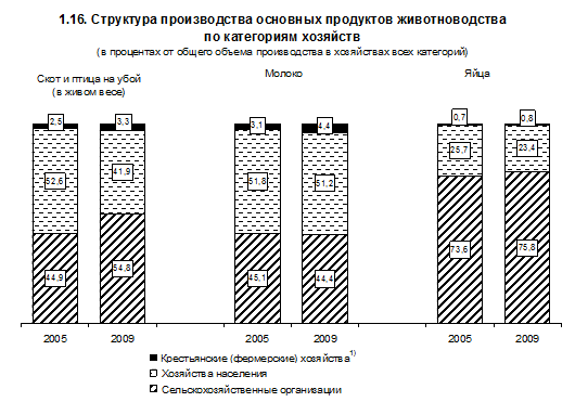 На основании статистических данных, приведенных Приложении (таблица 1), можно утверждать, что наметился рост посевных площадей. В данных, собранных за последние 3 года, наблюдается прирост посевных площадей с каждым годом и по каждой категории хозяйств. В таблице 2 приведены данные за последние 10 лет по структуре посевных площадей, и видно, что с момента проведения аграрной реформы, распределение посевных площадей изменилось. В сельскохозяйственных предприятиях количество этих площадей снижается, а в крестьянских (фермерских) хозяйствах растет. Произошло перераспределение сельскохозяйственных угодий, за счет образования фермерских хозяйств. В диаграммах 1 и 2, показана структура производства основных продуктов растениеводства и животноводства по категориям хозяйств. Приводится сравнение 2005 года с 2009 годом, резкого изменения не произошло, но по производству некоторых продуктов в растениеводстве и животноводстве заметно, что доля производства в хозяйствах населения снижается, а в сельскохозяйственных предприятиях и крестьянских (фермерских) хозяйствах растет. В 2001 году производилось валовой продукции сельского хозяйства в расчете на 100 га сельхозугодий 7159 тысяч рублей, что в 56 раз больше, чем в крупных сельскохозяйственных предприятиях, и в 89 раз - чем в крестьянских (фермерских) хозяйствах. [3, с 61] Данный показатель 2009 году, конечно, изменился, разница стала меньше, теперь в хозяйствах населения производство валовой продукции в расчете на 100 гектар сельхозугодий 34,8 млн. рублей, а это в 17 раз больше, чем в сельскохозяйственных предприятиях и в 28 раз - чем в крестьянских (фермерских) хозяйствах.
