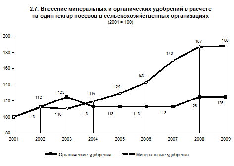 Убыточность сельскохозяйственных предприятий оказывает непосредственное влияние на качество обрабатываемых земель. Отсутствие материальных средств, приводит к тому, что земли используются не рационально. При минимальной обработке или её отсутствии снижается плодородие пашни, увеличиваются площади подверженные водной и ветровой эрозиям, расширяются масштабы загрязнения почв тяжелыми металлами, нефтью, пестицидами и прочее. Улучшение ситуации не скоро произойдет, хотя и действует целевая программа "Сохранение и восстановление плодородия почв земель сельскохозяйственного назначения и агроландшафтов как национального достояния России на 2006 - 2010 года и на период до 2012 года". Даже не смотря на то, что по отчету министра за 2008 год, все основные, запланированные действия были выполнены. В графике 1 показано внесение минеральных и органических удобрений в расчете на 1 гектар.
