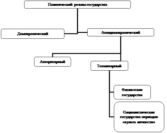Тоталитарный режим является, как правило, порождением XX в., это фашистские государства, социалистические государства периодов "культа личности". Сам термин появился в конце 20-х годов, когда некоторые политологи стремились отделить социалистическое государство от демократических государств и искали четкое определение социалистической государственности[22] . Тоталитарный режим является крайней формой авторитарного режима.