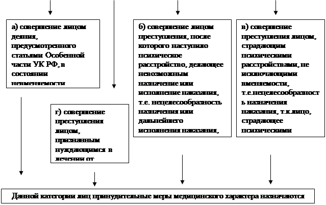 Основаниями для применения принудительных мер медицинского характера могут быть: совершение лицом деяния, предусмотренного особенной частью УК РФ в состоянии невменяемости; в случае последующего психического расстройства, лица, совершившего указанное деяние; совершившим преступление и страдающим психическим расстройством, не исключающими вменяемости; совершившим преступление и признанным нуждающимися в лечении от алкоголизма или наркомании.