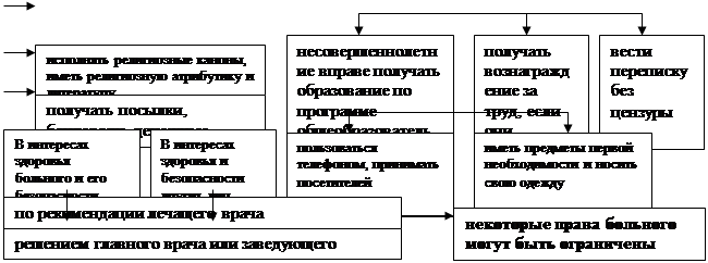 Права пациентов, которые по усмотрению администрации психиатрического учреждения могут быть ограничены, суть следующая: вести переписку без цензуры; получать и отправлять посылки, бандероли и денежные переводы; пользоваться телефоном; принимать посетителей; иметь и приобретать предметы первой необходимости, пользоваться собственной одеждой. Администрация и медицинский персонал психиатрического стационара обязаны создать условия для осуществления прав пациентов и их законных представителей.